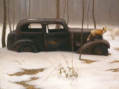 The scene depicts a late December thaw in progress, a time when red foxes are on the move. For the fox the old car provides the perfect lookout for scanning the surroundings and testing the air.